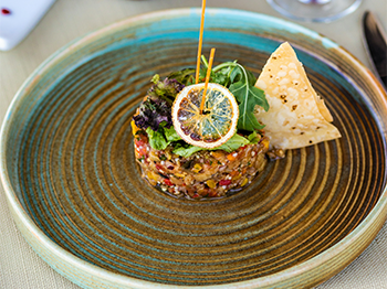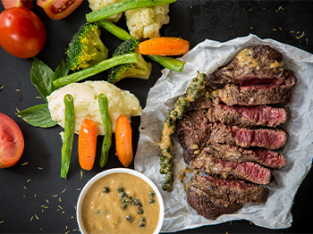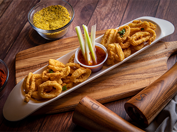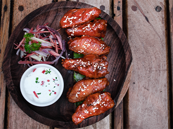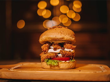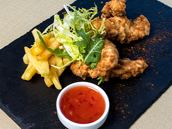 Filets de poulet pané avec un mélange d’épices maison, servis avec frites.