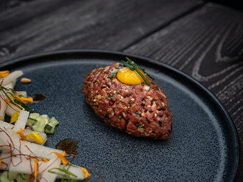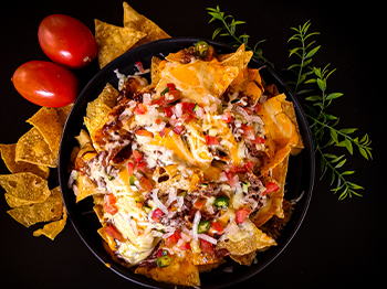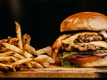 Deux galettes de bœuf, cheddar, bacon, tomate, laitue romaine, ognon rouge, sauce maison, servi avec frites.